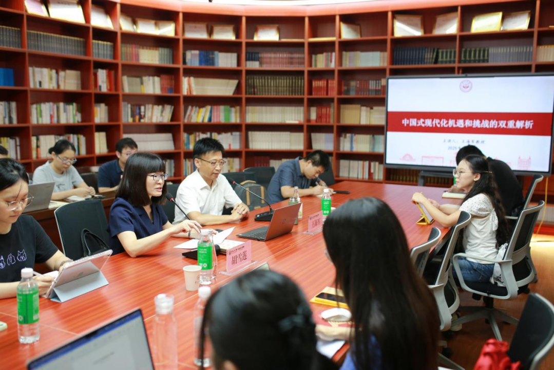 讲座伊始,王海军教授说,从2023年至今,“中国式现代化”已成为不同学科在科研教学中共同关注的议题,形成了比较丰富的学术成果。在此基础上,如何进一步推进“中国式现代化”的学理研究与深化?他从“机遇与挑战”双重解析的视野出发,对其中重点问题进行辨析:
