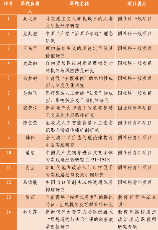 全国哲学社会科学工作办公室正式公布2025年国家社科基金年度项目立项名单,教育部社科司公布2025年教育部人文社会科学研究一般项目、高校思想政治理论课教师研究专项立项名单。我院共12名教师获批国家社会科学基金项目,其中一般项目6项,青年项目6项;2名教师获批教育部人文社会科学研究项目,其中青年项目1项,高校思想政治理论课教师研究专项1项。立项信息详见下表。