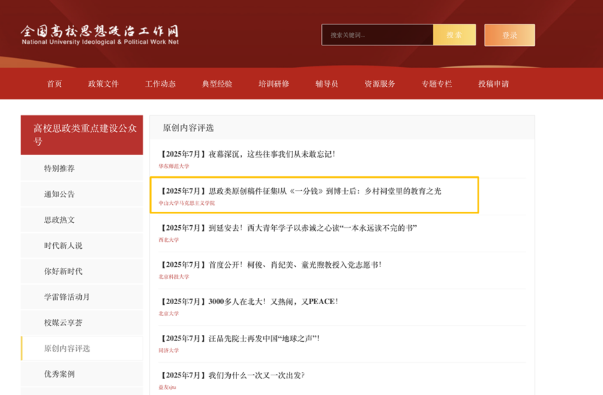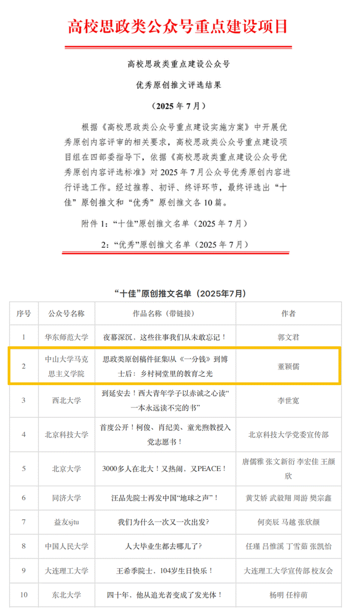 在教育部、中宣部、网信办、共青团中央四部门指导下,高校思政类公众号重点建设项目组每季度对全国重点建设思政类公众号优秀原创内容进行评选。在中山大学马克思主义学院韩伟副教授以及朱亚坤副教授的指导下,我院2024级硕士研究生董颖儒完成的原创作品《从〈一分钱〉到博士后:乡村祠堂里的教育之光》荣获2025年7月“十佳”原创内容!