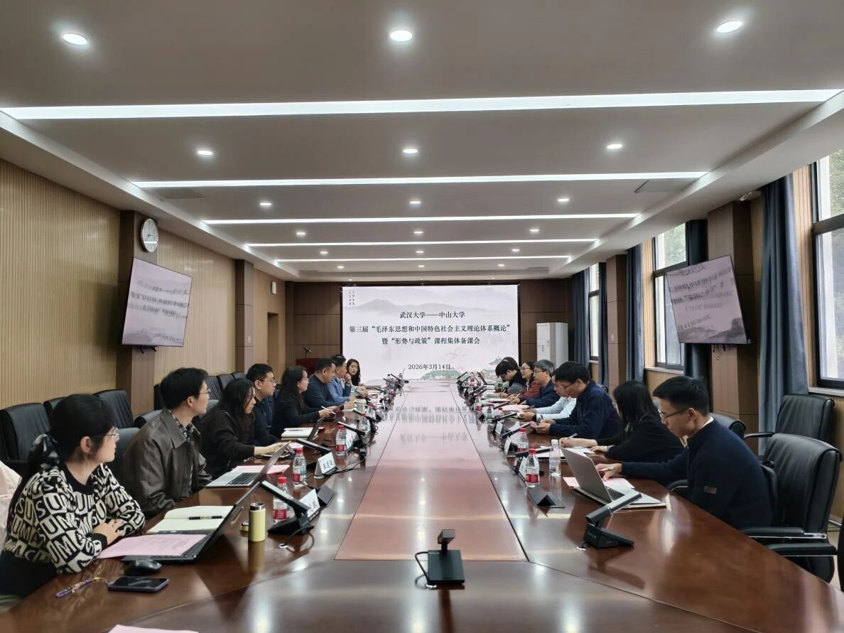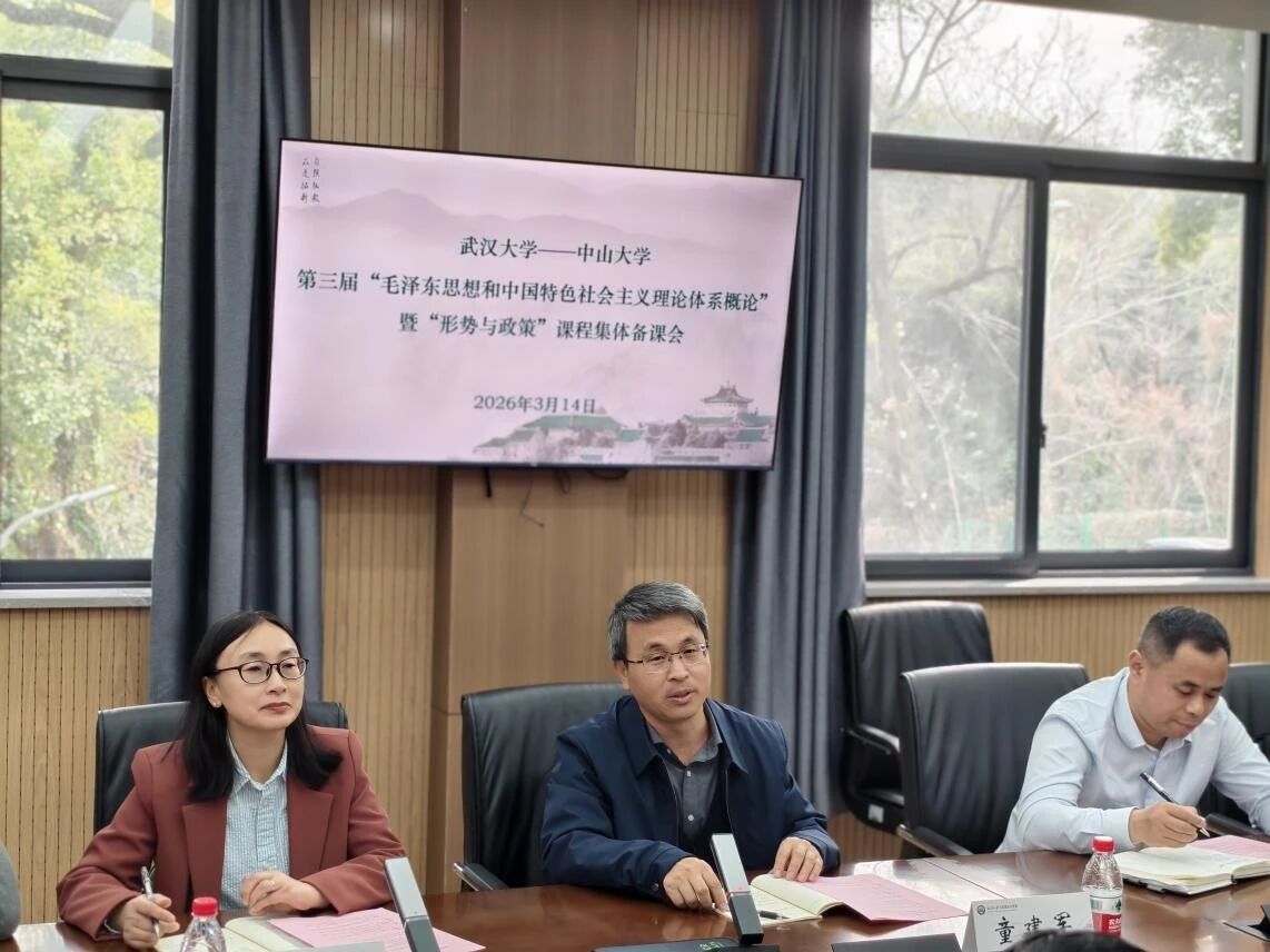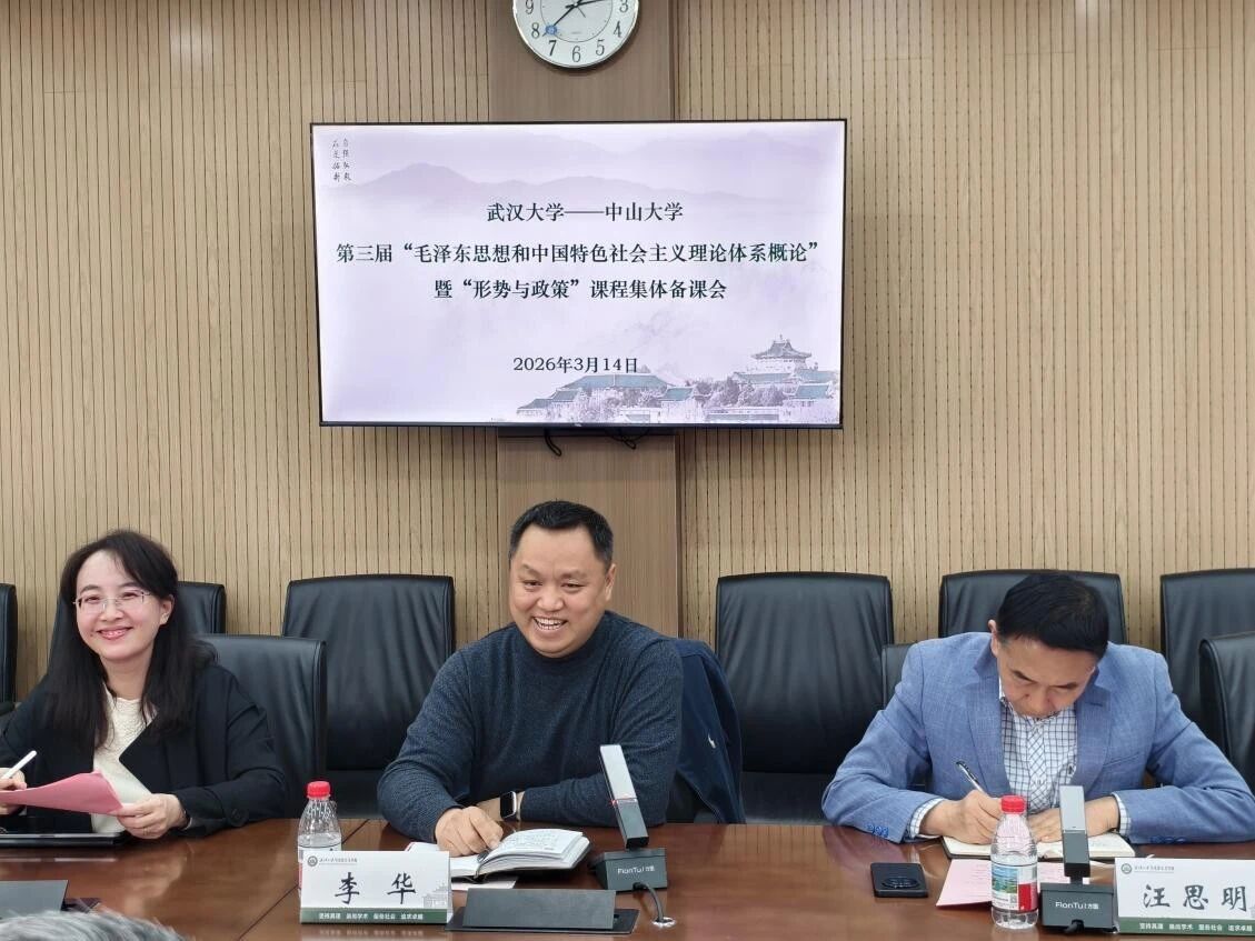 2026年3月14日下午,中山大学马克思主义学院与武汉大学马克思主义学院联合举办“毛泽东思想和中国特色社会主义理论体系概论”暨“形势与政策”课程集体备课会。围绕“推动新时代思政课教学高质量发展的理与路——以教学改革和教师成长为中心”这一议题,两院教师代表依次作报告。武汉大学马克思主义学院副院长李华、数学与统计学院党委副书记汪思明,中山大学马克思主义学院副院长童建军参加集体备课。本次会议由武汉大学马克思主义学院“概论”教研中心副主任付克新、教师教学发展中心副主任陈慧女和中山大学马克思主义学院“概论”教研室主任李文珍联合主持。