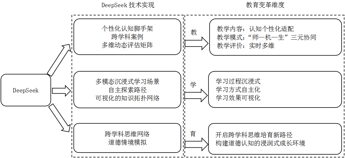 《重庆高教研究》3月刊发我院助理教授郭蕾蕾文章《生成式人工智能驱动教育变革:机制、风险及应对——以DeepSeek为例》。 摘 要:科技的快速发展推动人工智能技术的不断进步,以DeepSeek为代表的生成式人工智能正引发教育领域的一场认知革命。DeepSeek通过混合专家架构的动态路由机制、群体相对策略优化的推理验证框架,以及可解释性链式推理技术,构建了“精准调度—推理增强—认知表达”的技术闭环。这种技术创新促使通用内容生产工具升级为具备跨学科思维能力的认知伙伴,推动了“机器辅助”向“人机共智”的范式跃迁。凭借其超强的自然语言理解、跨模态内容生成和长链推理能力,DeepSeek从“教”“学”“育”3个维度推动学校教育深层变革。在“教”的维度,推动构建个性化、多元化、动态化的教学体系;在“学”的维度,协助打造沉浸式、自主化和可视化的学习形态;在“育”的维度,助力重塑能力为重、价值为先的育人理念。然而,技术创新助力学校教育变革的同时也会带来不可忽视的风险,如虚假信息冲击教育根基,隐性偏见侵蚀教育育人功能,认知依赖抑制主体性发展,以及数据泄露威胁教育隐私安全等。因此,应从构筑师生AI素养进阶体系,打造“师—机—生”协同共进的教育新生态,以及构建透明与公平的监管体系等方面激活生成式人工智能的赋能密码,助力教育数字化转型向善向好,为培养适应未来社会的创新人才筑牢坚实基础。 关键词:DeepSeek;生成式人工智能;教育变革;教学体系;学习形态;育人理念 全文转载如下 一、问题提出 生成式人工智能(generative artificial intelligence,GAI)的技术演进正在重塑人机协同新范式。自OpenAI推出ChatGPT以来,GAI技术进入快速发展期,其应用边界不断拓展。2025年1月,中国深度求索公司发布DeepSeek模型,标志着生成式AI技术实现新的关键突破。DeepSeek是专注推理能力的大型语言模型,通过优化推理过程显著降低了计算资源的消耗,实现了高效的推理能力。在数学推理领域,DeepSeek超越了OpenAI-o1;在编程能力方面,超越了96.3%的人类参赛者。该模型基于混合专家架构(Mixture-of-Experts,MoE)实现领域专家模块的动态智能调度,通过群体相对策略优化机制(Group Relative Policy Optimization,GRPO)增强推理性能,并创新融合可解释性链式推理框架(Chain-of-Reasoning, CoR)实现思维过程的可视化。与传统模型相比,DeepSeek的突破性体现在:(1)知识生成精准度提升。通过采用混合专家架构的动态路由机制,系统实时分析输入任务的领域属性,精准激活最优专家模块(如数学推理、代码生成、科学论证等)协同工作。(2)推理能力显著增强。借助大规模强化学习,DeepSeek 能在多种任务中不断自我优化,在复杂推理任务上更灵活、准确,打破了推理能力瓶颈。(3)认知过程可解释性突破。DeepSeek模型不仅能输出结果,还能可视化推理过程,将隐式逻辑链转化为可解释的推导路径,显著提升了模型透明度。这些技术突破对社会方方面面尤其是教育领域产生重大冲击和影响,将有力推动教育智能化变革。 自ChatGPT问世以来,GAI对教育领域的影响引发学界的广泛讨论和关注。这些研究有从教学层面探讨GAI对新型课堂评价、生成式教学、教学模式变革的影响;也有从学生学习层面揭示GAI对沉浸式学习、个性化学习、在线学习以及学习范式创新的影响;还有从育人角度阐明GAI如何变革育人理念和育人路径等。然而,这些研究仍存在以下不足:(1)主要聚焦单一维度,尚未从“教学—学习—育人”的系统框架来全面揭示GAI驱动教育变革的内在机制;(2)大多基于行为主义范式探讨GAI的工具效率,忽视其对认知生态的重构潜能。作为一种认知增强型GAI,DeepSeek的长推理链技术不仅能可视化思维节点,更能通过动态可调的推理粒度控制,将维果茨基的“最近发展区”理论转化为可操作的智能辅导系统,为教育主体构建符合认知水平的数字脚手架。它的技术突破有潜力从“教”“学”“育”3个维度驱动教育变革,助力教育主体认知增强。同时,技术发展也伴随新型风险,如知识真实性、价值偏离、认知能动性衰减和信息安全风险等。基于此,本文旨在全面厘清DeepSeek驱动教育变革的内在机制与潜在风险,提出具有针对性的治理策略,以期为教育领域更好地应用GAI技术提供理论支持和实践指导。 二、DeepSeek驱动教育变革的内在机制 当前,教育领域面临多重挑战:教学内容更新滞后,信息技术与教学融合不足,教育公平推进受阻,以及国际化进程缓慢等。尽管信息技术为教育数字化提供了工具支持,但其实际应用仍面临跨学科知识整合效率低、个性化教学支持不足等局限。在此背景下,DeepSeek凭借多模态生成、跨学科整合与逻辑推理能力,从“教”“学”“育”3个维度推动教育的系统性变革。在“教”的维度,DeepSeek通过构建多维动态评估矩阵,生成个性化认知脚手架和跨学科案例,促进教学内容个性化、教学模式多元协同化和教学评价实时多维化;在“学”的维度,DeepSeek通过搭建多模态沉浸式学习场景,构建可视化的知识拓扑网络,支持学习者自主探索,助力打造沉浸式、自主化和可视化的学习形态;在“育”的维度,DeepSeek基于混合专家架构构建跨学科的思维网络,利用多模态生成技术创设道德情景模拟,系统化培养跨学科思维与道德认知能力(如图1)。 图1 DeepSeek驱动教育变革的内在机制 (一)“