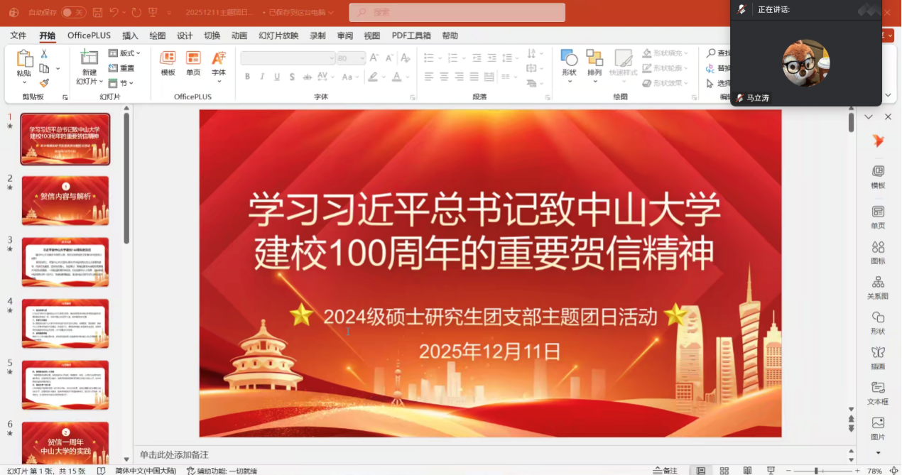 12月11日晚,2024级硕士生团支部聚焦“学习习近平总书记致中山大学建校100周年的重要贺信精神”开展主题团日活动。活动围绕“贺信精神学习、贺信精神实践、贺信精神的启示及经验”三个维度展开。团员们深入学习贺信核心要义,牢记习近平总书记关于中山大学“坚持思想引领、传承红色基因、聚焦国家战略、推进教育科技人才协同发展”的殷切嘱托。通过了解贺信致送一周年以来学校在教育教学、科学研究、社会服务等领域的实践成果,团员们深刻体会到中大人“心怀国之大者”的责任担当。在交流讨论中,大家明确表示,要践行“博学、审问、慎思、明辨、笃行”的校训,将个人理想融入强国建设、民族复兴的伟大梦想,以扎实专业能力服务国家战略需求。